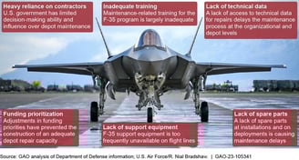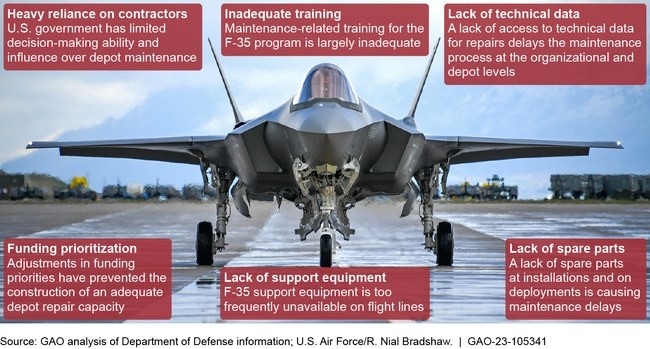 The F-35 acquisition program is of urgent concern and requires government intervention. The problems that the Government Accountability Office identified in the picture are known as #ShowStoppers. They are sustainment concerns and are untenable. The F-35 program uses a two-level logistics infrastructure concept whereas the F-15 and other legacy aircraft like the F-16 and the A-10 use a three-level concept.